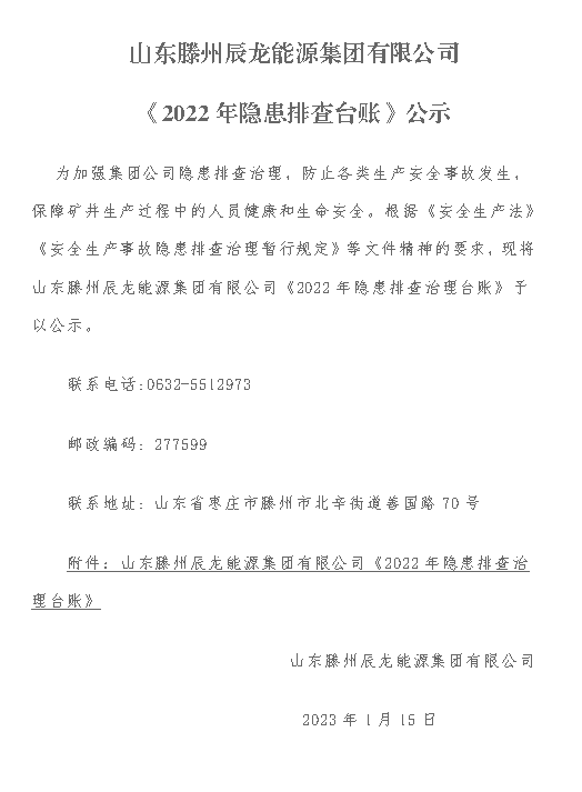 为加强集团公司隐患排查治理,防止各类生产安全事����� �������Ƴ������������ �������Ƴ������������ �������Ƴ����������� �������Ƴ�������故发生,保障矿井生产过程中的人员健康和生命安全。����� �������Ƴ������������ �������Ƴ������������ �������Ƴ������������ �������Ƴ�������根据《安全生产法》《安全生产����� �������Ƴ������������ �������Ƴ������������ �������Ƴ������������ �������Ƴ�������事故隐患排查治理暂行规定》等文件精神的要求,现����� �������Ƴ������������ �������Ƴ����������� �������Ƴ������������ �������Ƴ�������将山东滕州辰龙能源集团有限公司����� �������Ƴ������������ �������Ƴ����������� �������Ƴ������������ �������Ƴ�������《2022年隐患排查治理台账》予以公示。����� �������Ƴ������������ �������Ƴ������������ �������Ƴ������������ �������Ƴ������...